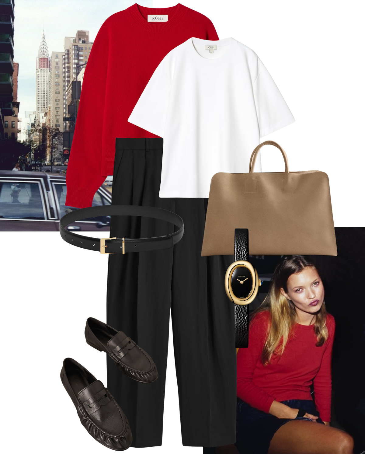 A Red Knit layered over a white tee with tailored trousers + loafers