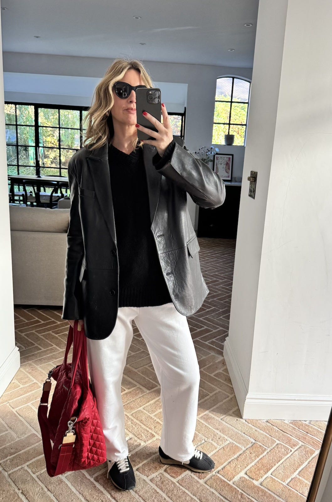 A casual day in sweatpants and sneakers pulled together with a leather blazer and pop of red from The Metro Tote.