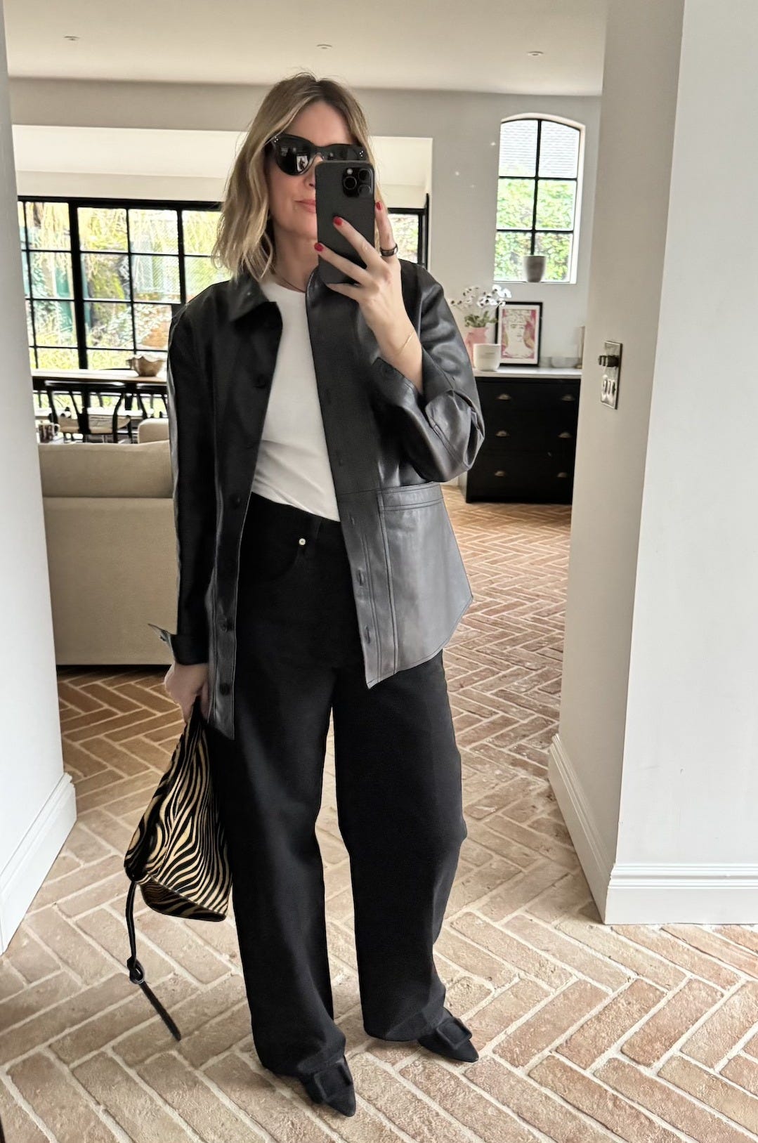 I’ve been living in these jeans. The Ayla Baggy has reignited my love for a black jean, paired with Sézane’s Leather Will Shirt, old Manolo Blahniks, and finished with an Arket Animal-Print Bag for a bit of interest.