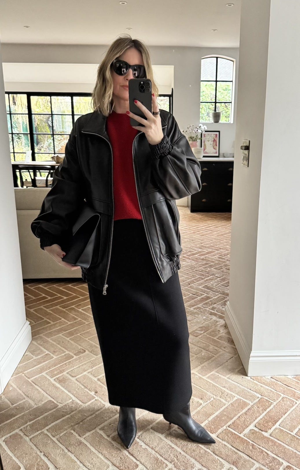 Red Knit | Leather Jacket | Skirt (Similar) | Boots (old, linked similar) | Bag
