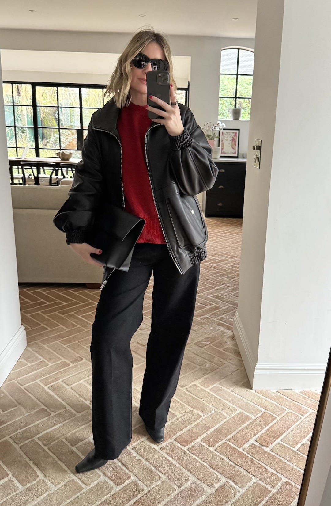 The same jeans with a red knit from Róhe and my Nour Hammour bomber. Finished with a clutch from Freja to dress it up slightly.