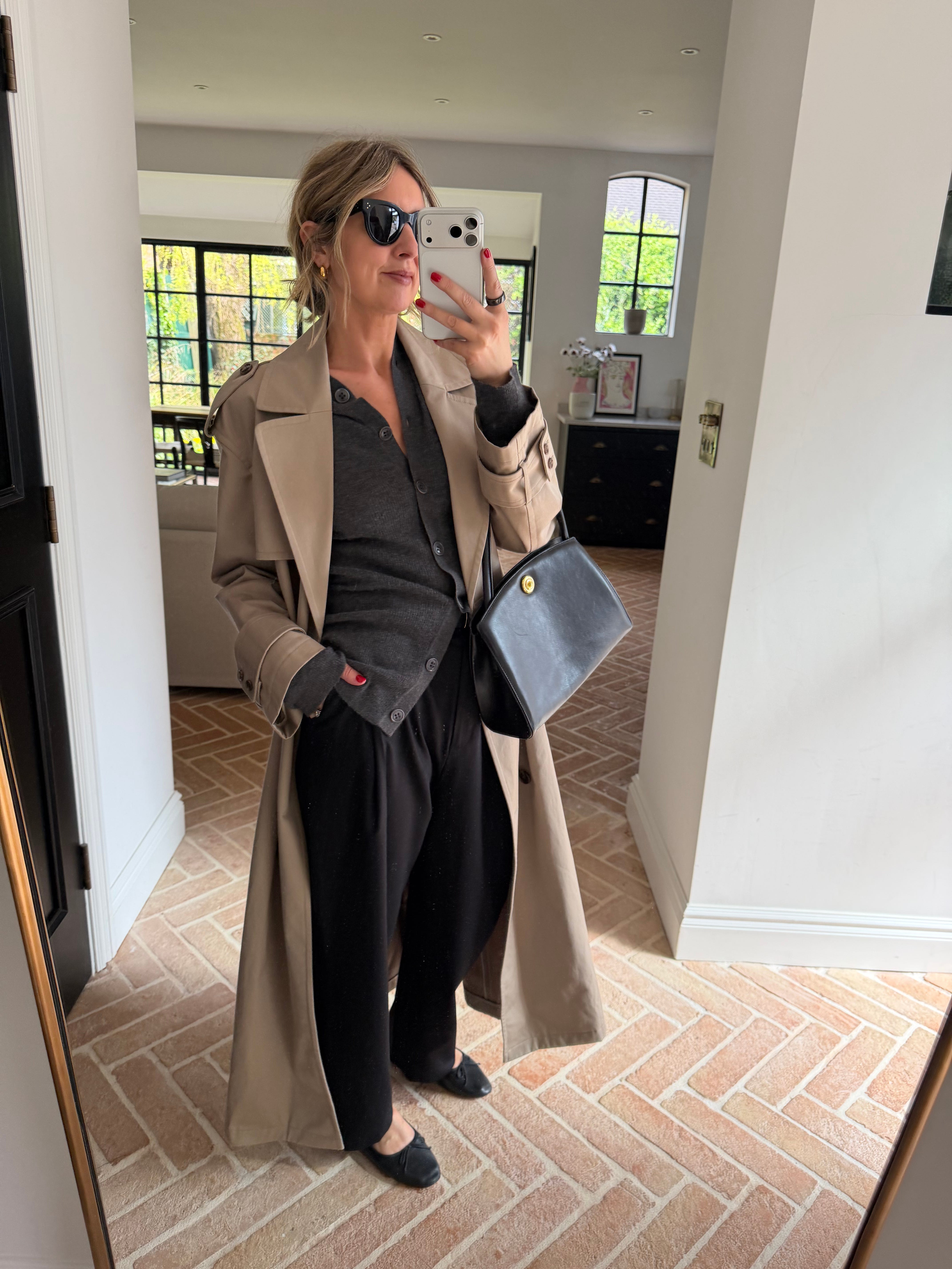 Trousers | Cardigan (old Raey, similar here) | Trench | Bag | Flats | Sunglasses