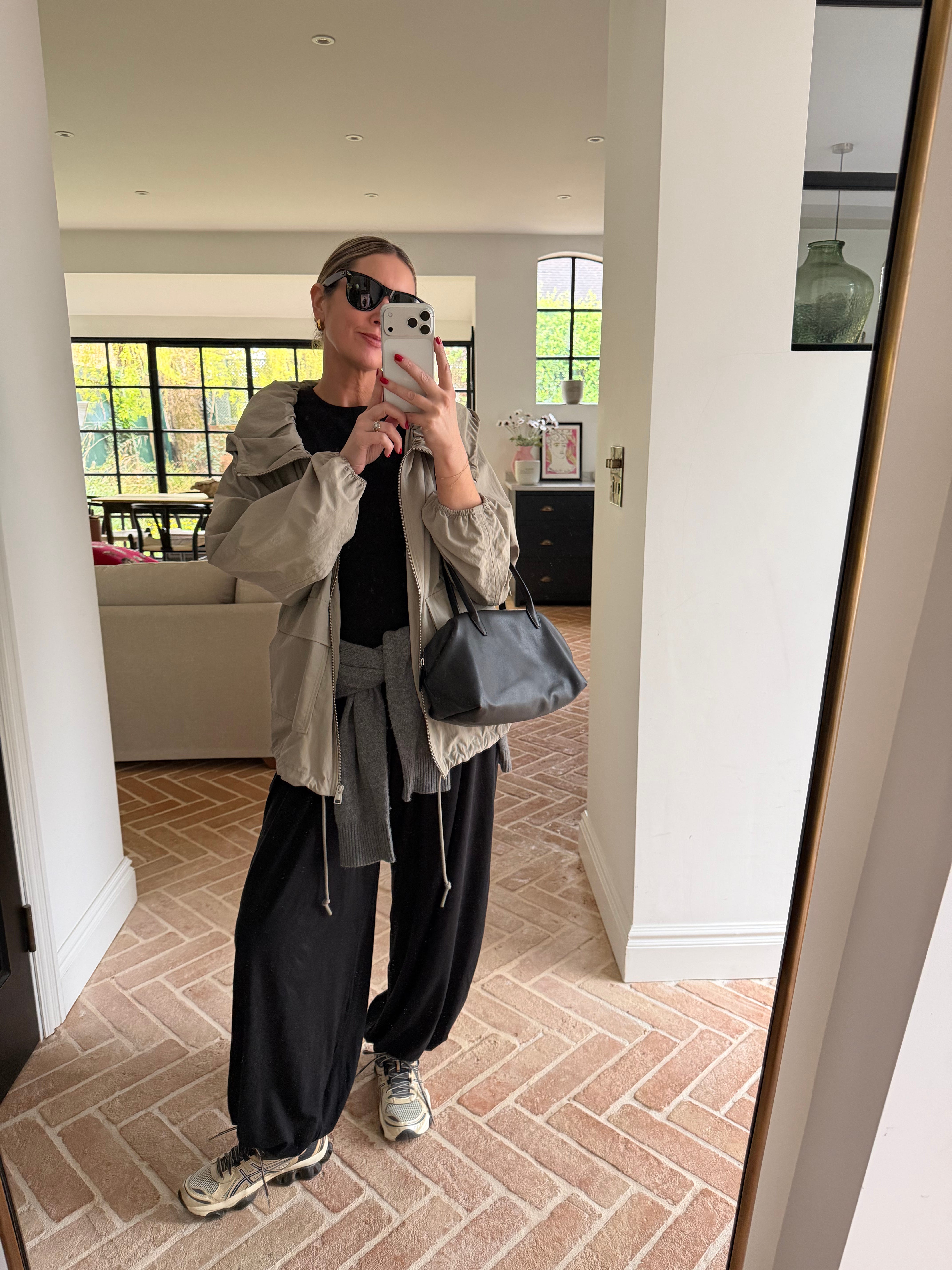 Trousers (S, but they come up big) | Tee | Jumper | Jacket | Trainers | Bag | Sunglasses