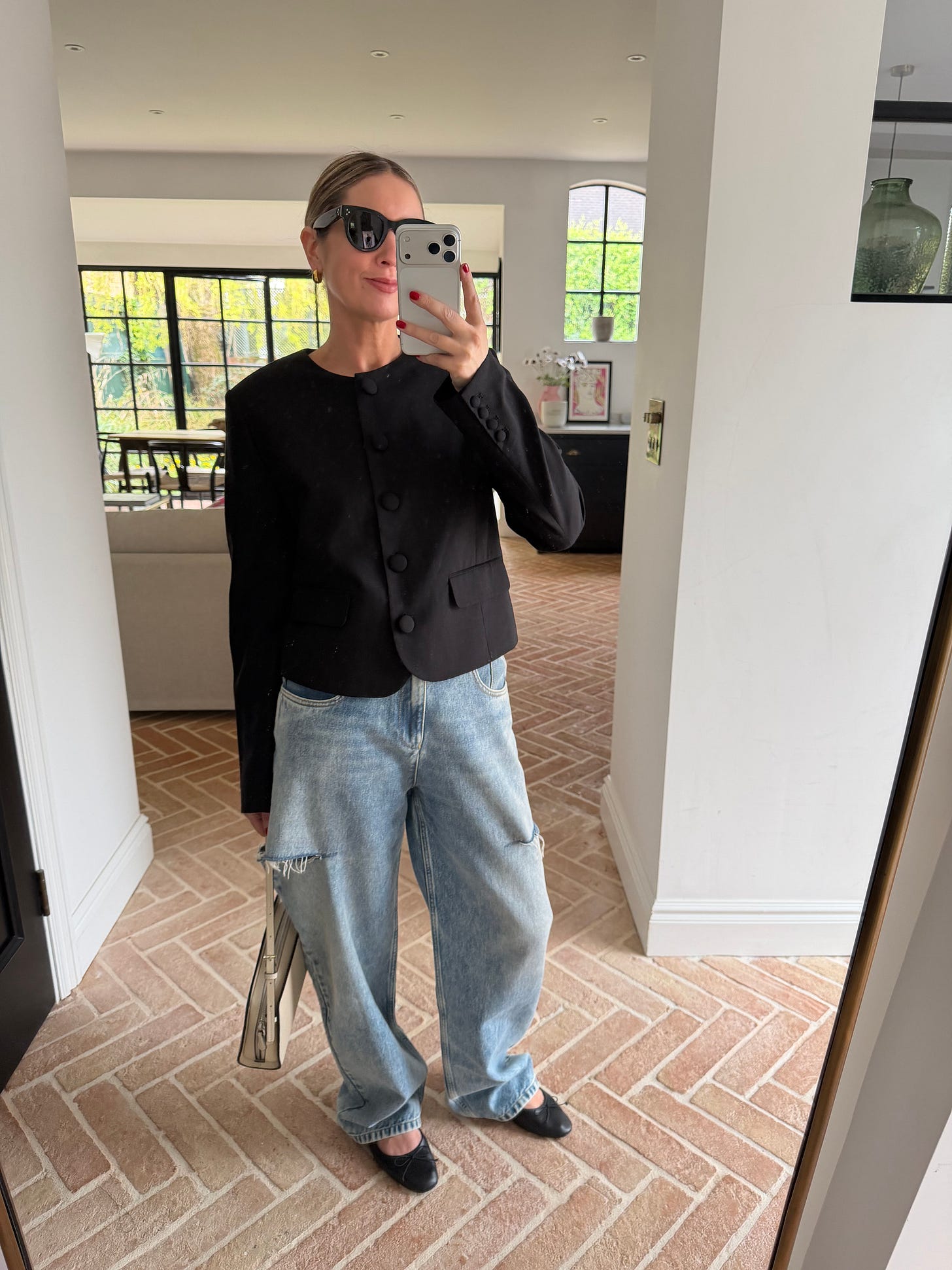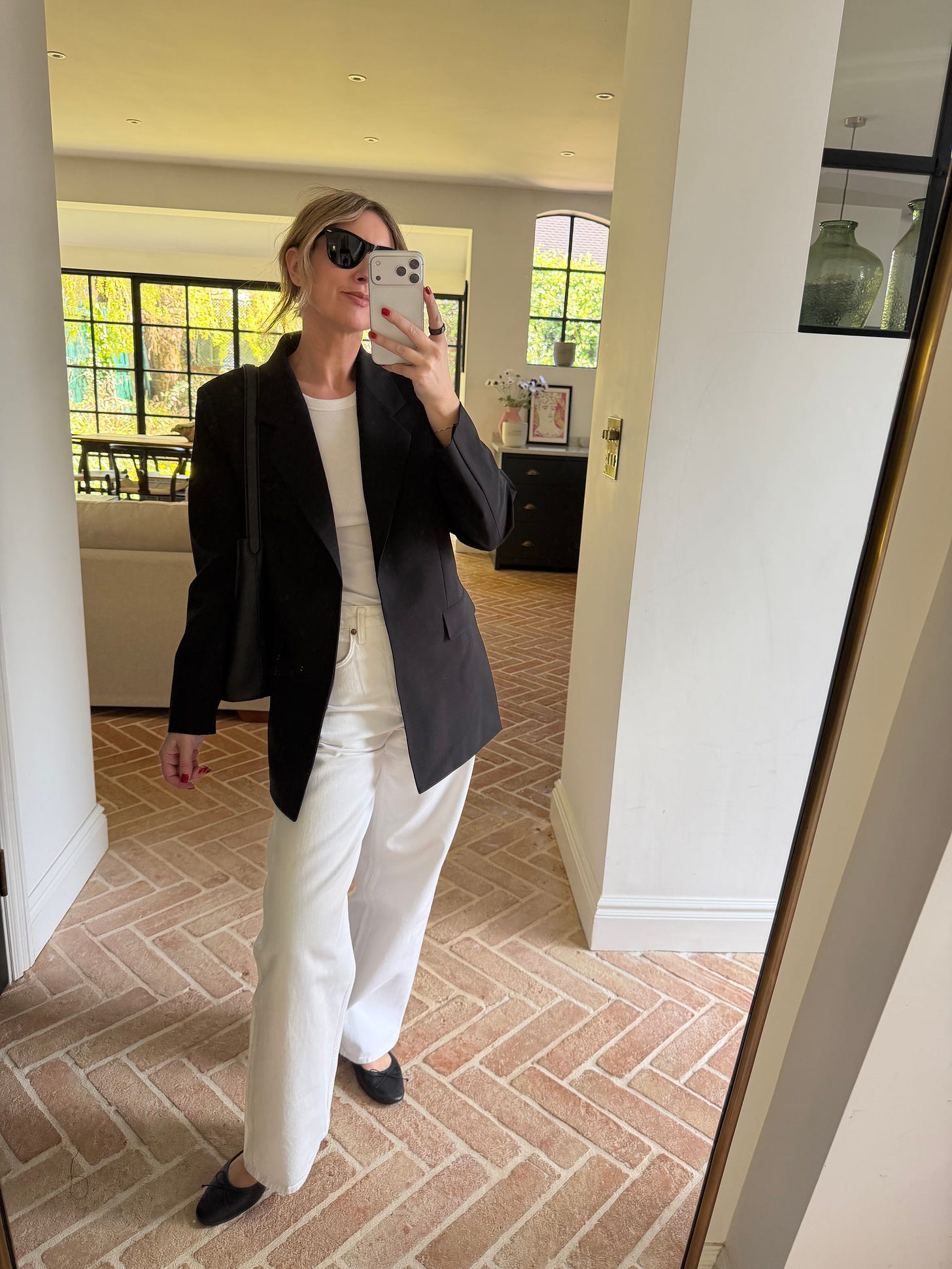 Teaming my Agolde Baggy Jeans with Black - a long-line Theory Blazer, Horse Esme Tote and Ballet Flats. I find the contrast keeps the white jeans from looking too twee and giving them a little edge.
