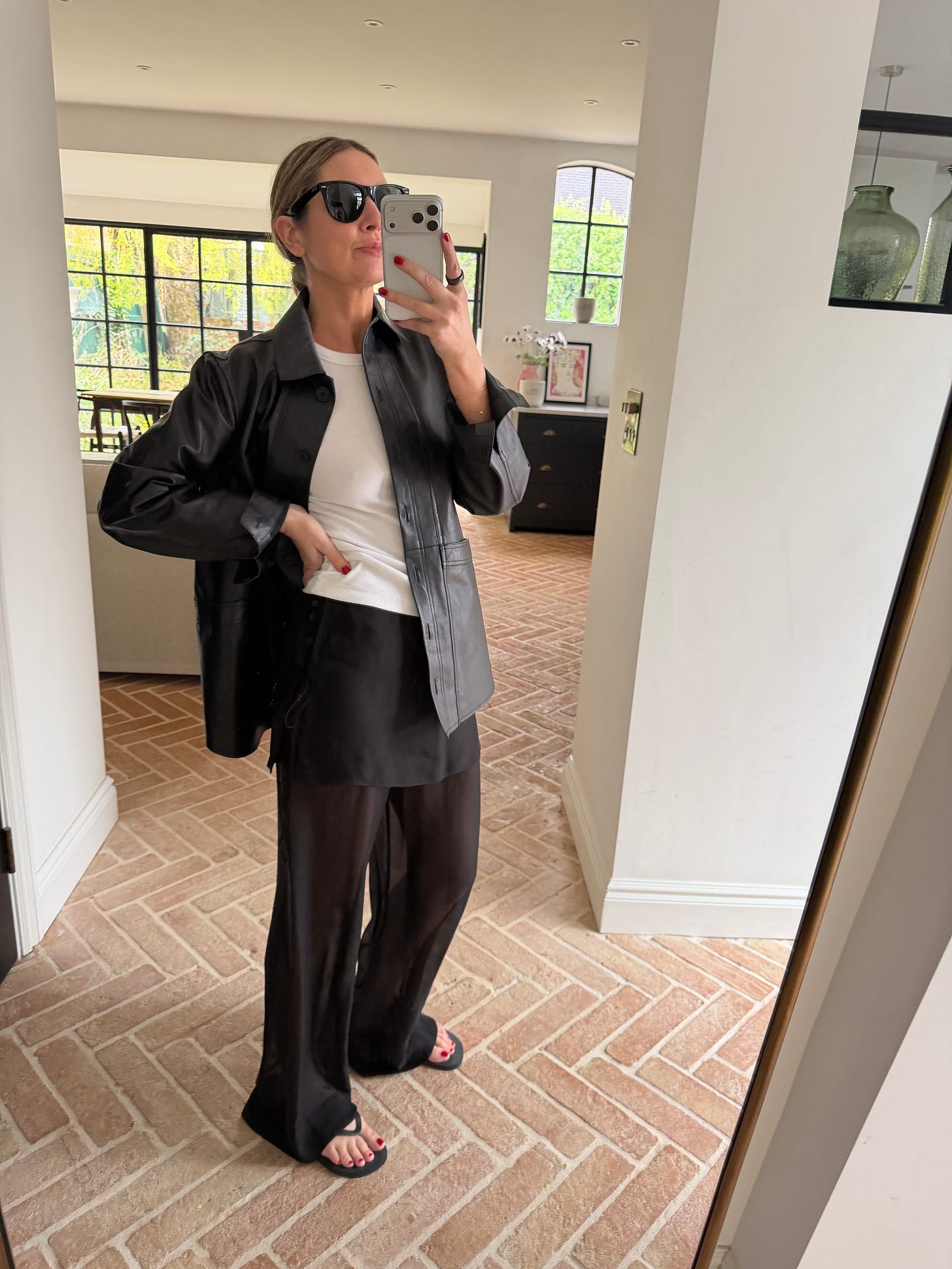 These Massimo Dutti Sheer Trousers arrived last week with a skirt overlay and I’m so in love with them. Different from anything I own but I can style with all of my go-to pieces. I’m so excited style these this summer - I threw them on here with my Sezane Leather Jacket and Flip flops, I’ll also dress them up with a heel and blazer and throw on on holiday over swimwear.